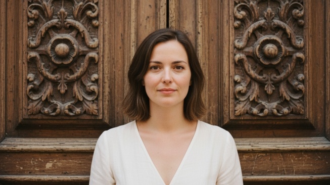 4. Potret close-up dari diriku berdiri di depan pintu kayu tua dengan ukiran detail di Venice, Italia. Cahaya matahari pagi keemasan menyinari wajah, efek bokeh pada latar belakang. Cinematic, high detail, f/1.4 lens.