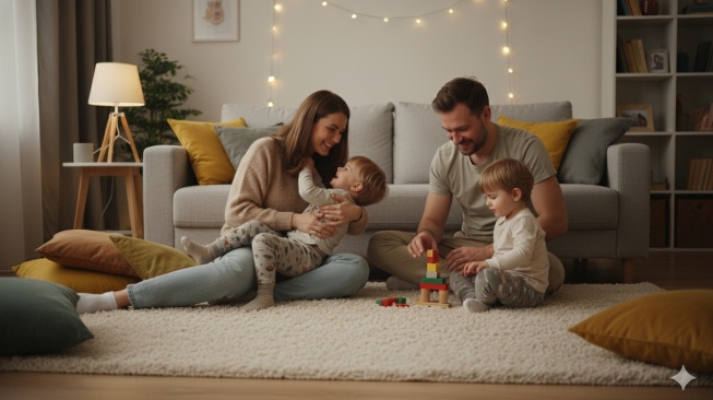 Buat suasana santai dengan keluarga yang sedang bermain di lantai ruang tamu di atas karpet tebal. Tambahkan bantal-bantal berserakan dan pencahayaan lembut dari lampu ruangan. Fokus utama ada pada interaksi antaranggota keluarga yang saling berinteraksi dengan penuh kehangatan.