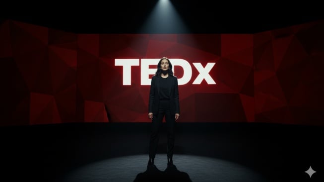3. Buatkan foto seorang wanita memakai jas hitam dan kaus hitam di dalamnya, sedang berdiri di tengah spotlight panggung TEDx-style dengan background merah hitam. Kualitas ultra HD, kontras kuat, landscape 16:9.