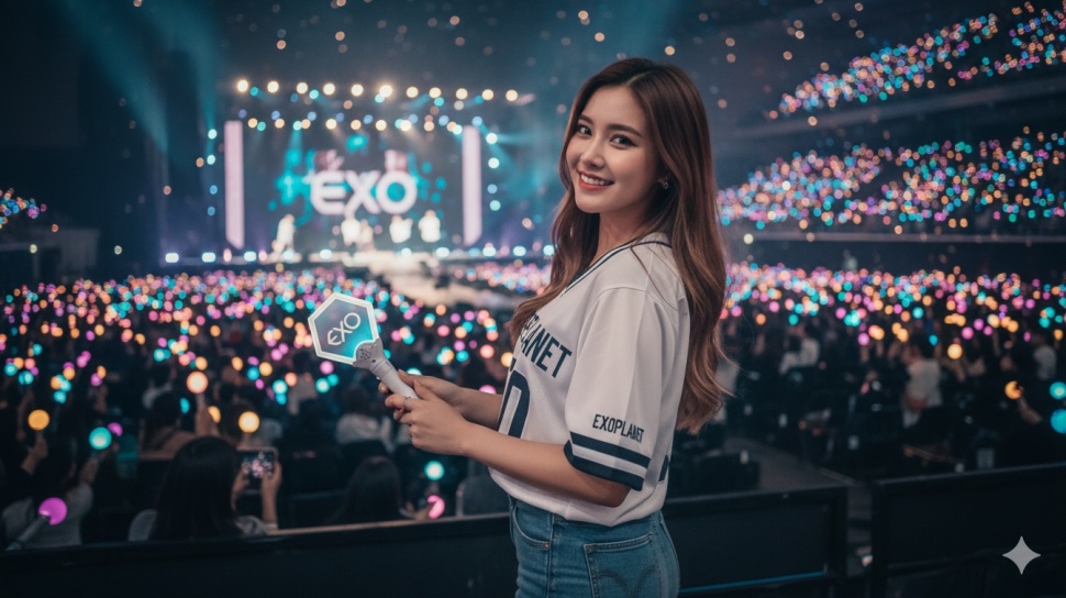 2. Buatlah foto wanita sedang menikmati konser K-POP EXO di Seoul Arena. Wanita mengenakan baju jersey Exoplanet putih dan jeans. Wanita memakan riasan makeup natural sedang tersenyum menghadap kamera dengan posisi badan menyamping. Tangannya sedang memegang lightstick EXO.