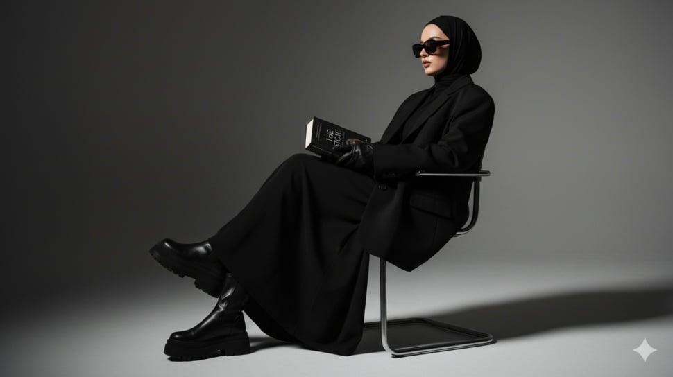 4. Seorang wanita muda berhijab tampak duduk santai di kursi dalam studio foto, diambil dari angle samping. Ia mengenakan outfit serba hitam berupa blazer oversize, rok panjang, sepatu boots, dan kacamata hitam yang memperkuat kesan misterius. Dengan gaya elegan sekaligus edgy, ia memegang sebuah buku bertema stoic, seakan larut dalam suasana modern yang penuh karakter. Wajah tetap dipertahankan apa adanya, sementara atmosfer keseluruhan menonjolkan nuansa estetik yang sederhana namun berkelas.