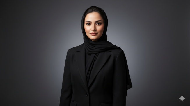2. Buat foto potret diri seorang wanita cantik berjilbab setengah badan di studio, memakai setelan blazer hitam modern, latar belakang polos abu-abu gelap, pencahayaan tiga titik (key light, fill light, back light) yang lembut dan dramatis, pose wajah menghadap kamera, ekspresi tenang dan percaya diri, gaya foto formal dan elegan.
