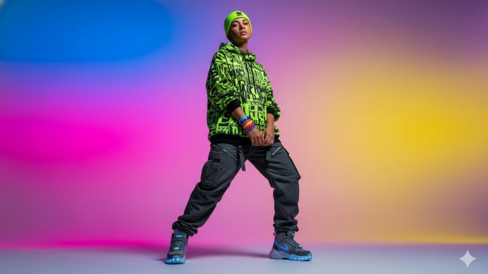 8. Potret studio gaya Gen Z dengan outfit streetwear, background gradient colorful.