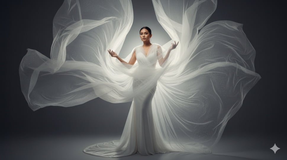 3. Pose dengan kain transparan atau tulle: kain melayang-layang di studio, subjek menahan sedikit kain dengan tangan, efek dramatis, latar belakang gelap atau abu-abu lembut, cahaya dari belakang agar kain sedikit bersinar.