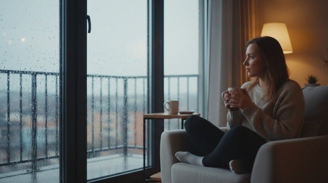 A person sitting by a large window watching the rain, soft indoor lighting, raindrops on glass, introspective and cinematic mood.