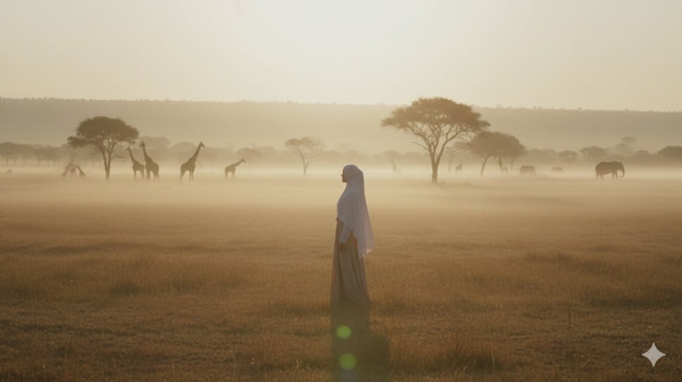 4. Ciptakan suasana pagi hari di savana Afrika dengan kabut tipis, sinar matahari menembus dedaunan, dan wanita berhijab berdiri tenang memandang cakrawala. Gaya fotografi atmosferik dan lembut.