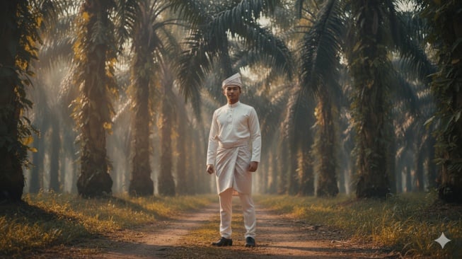 1. Ilustrasikan karakter mengenakan pakaian adat Melayu modern berdiri di tengah jalur sempit kebun sawit, sinar mentari sore menyinari dari samping, pelepah sawit menjulur ke arah kamera menciptakan efek kedalaman, tampilan sinematik penuh warna alami.