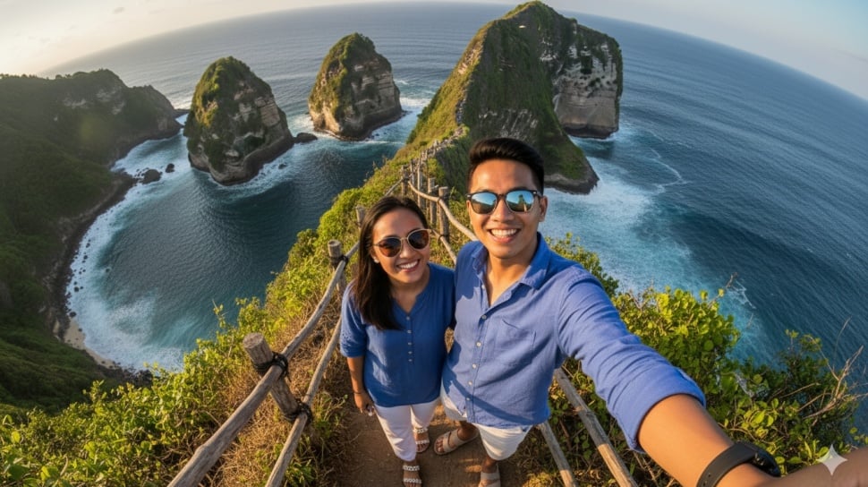 Dengan memberikan prompt (perintah teks) yang tepat, kamu bisa mengubah foto berdua yang biasa saja menjadi sebuah potret epik dengan latar keajaiban alam di Bali.