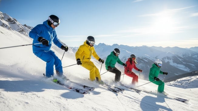 5. Gunakan wajah dari foto yang diunggah, menampilkan dua hingga empat teman sedang beraksi. Ubah latar menjadi pemandangan pegunungan salju yang indah, sedang bermain ski menuruni lereng yang tertutup salju putih. Tambahkan bayangan papan ski yang menoreh permukaan salju, serta salju dengan butiran es kecil yang terangkat ke udara saat mereka meluncur. Para teman harus mengenakan baju musim dingin yang cocok untuk bermain ski namun tetap tampak modis dan profesional.