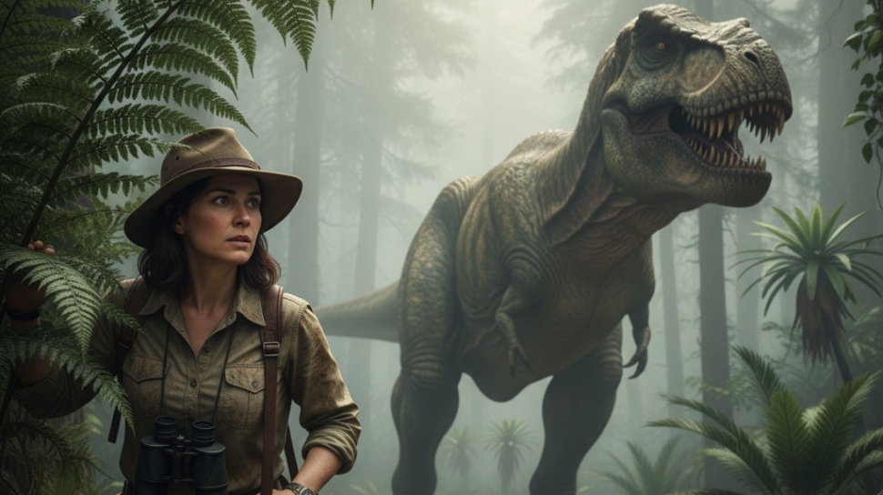 1. Ubah foto saya menjadi seorang peneliti di era Jurasik. Saya bersembunyi di balik semak pakis raksasa sambil diam-diam mengamati Tyrannosaurus Rex yang besar di hutan. Photorealistic, foggy jungle environment, shallow depth of field, dramatic survival scene.