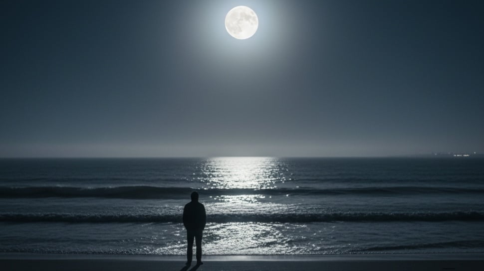 Pemandangan pantai malam hari dengan seseorang berdiri di bawah sinar bulan purnama. Cahaya bulan memantul di permukaan laut dan menciptakan bayangan lembut di pasir, menghasilkan suasana sinematik dan dramatis yang unik.
