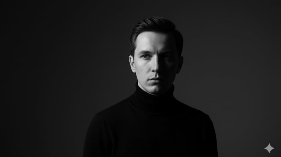 5. Foto hitam putih di studio dengan kontras tinggi. Subjek mengenakan turtleneck hitam dan ekspresi serius. Latar abu gelap, pencahayaan dari satu sisi menghasilkan bayangan tegas dan dramatis.