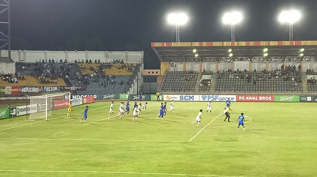 Laga PSPS Pekanbaru vs Persekat Tegal di Stadion Kaharuddin Nasution Pekanbaru, Minggu (19/4/2026) malam. [Suara.com/Eko Faizin]